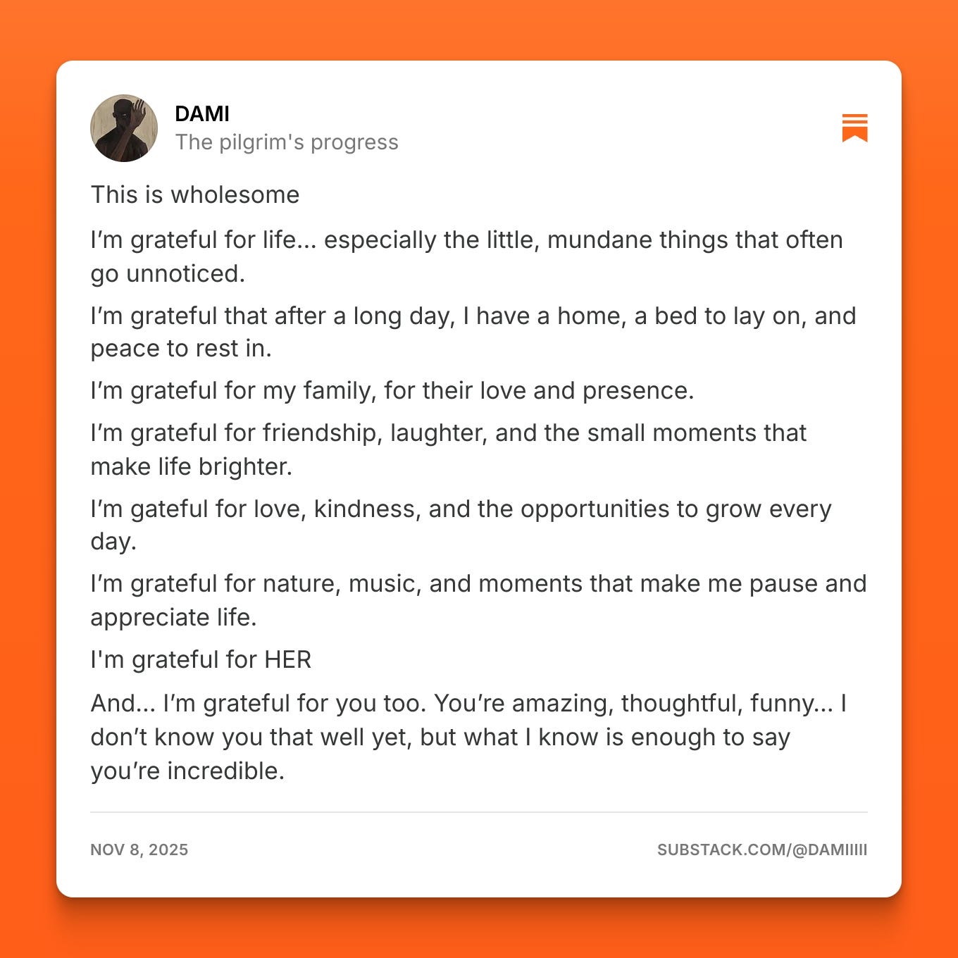 And then there's Dami. THE DAMI! Tobi asked me, “how did you become friends with THE Dami?” And I was like, I don't knowwwww.😭😭 it just happened. Truly, it's the people you barely know that make you feel seen. Thank you, my friend, for your kind words. And please, when are we getting the new episode of “everybody in this house is mad?”😪