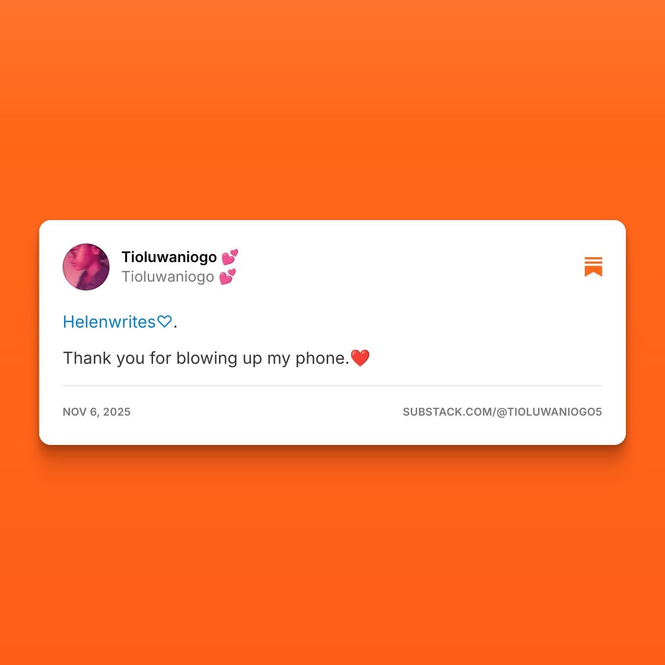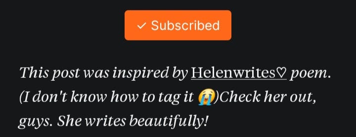 There's Tobi. When I first saw this, I was surprised. I didn't think I'd ever be able to inspire anyone. I didnt even believe that anyone would notice, not to talk more of read my writing. Thank you, Tobiiii. This made me feel so special 🥺.